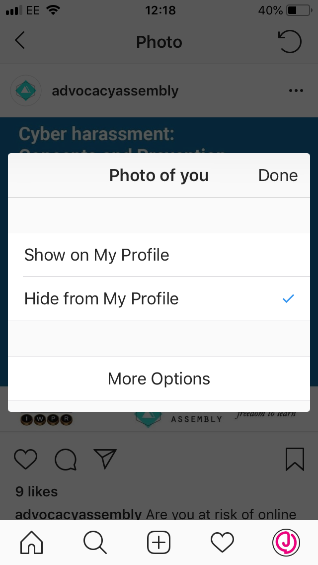 If you notice that you have been tagged in unrelated or inappropriate images, you can disassociate your profile with it by tapping the three dots at the top right-hard corner of the image.