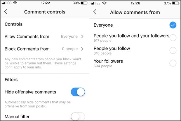 You are also able to choose to change who is allowed to comment on your posts, not user by user, but by the choice of either everyone, people you follow and your followers, people you follow or your followers.