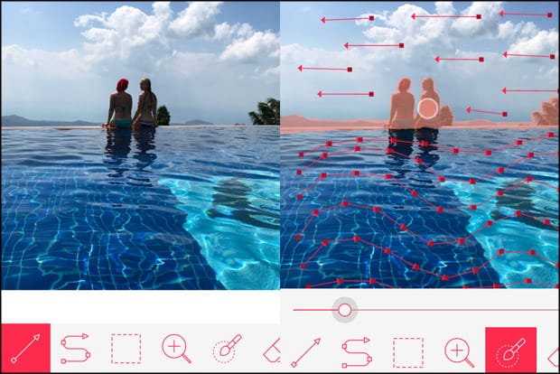 The arrow button on the far left will create a straight animation in your photo – great if you need something to move in a straight line, like the sky or water. Tap and drag your finger along the screen in the direction and place you want the movement, from start to finish – the shorter the arrow, the more frantic and fast the animation will be.