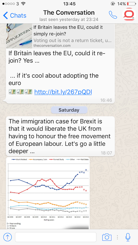The Conversation, an outlet combining reporting with expert commentary from academics, started broadcasting analysis about the referendum through WhatsApp last Tuesday (13 June).
