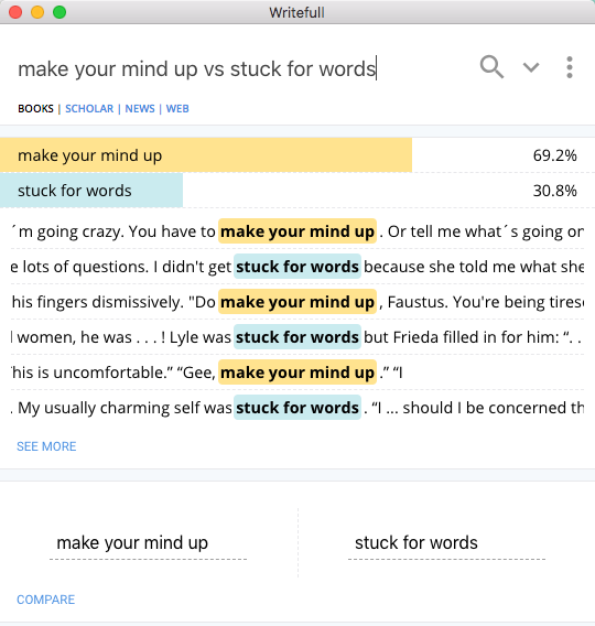 If you cannot make up your mind between words or phrases, 'compare' will show you the more popular choice across the database you have selected in percentage, which may affirm the more favourable option for you.