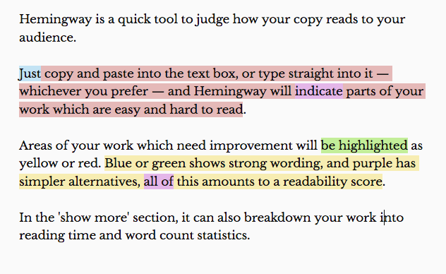 Just copy and paste into the text box, or type straight into it, and Hemingway will show the parts of your work which are easy and hard to read.