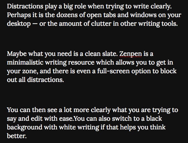 Zenpen is a minimalistic writing resource which encourages you to get in your writing zone — essentially a clean slate to help you see clearly what you are trying to say.