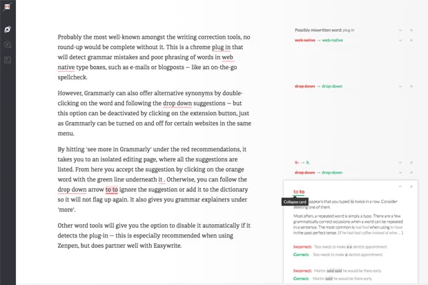 Probably the most well-known amongst the writing correction tools, this chrome plug-in detects grammar mistakes and poor phrasing of words in web-native type boxes, such as e-mails or blogposts — like an on-the-go spellchecker.