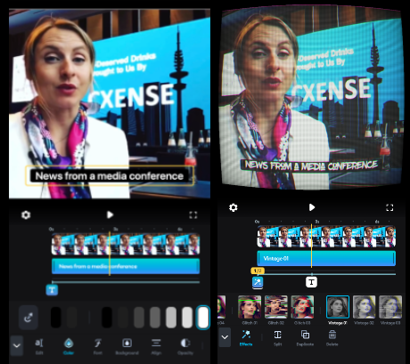 To add subtitles, tap the 'text' icon and start writing. You can select text colour, background and font, and even add sounds from the app's database or a voiceover. Finally, you can choose from an array of effects if that is your thing.