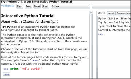 Try Python is a full interactive platform where a live Python console guides the users in all the paradigms of this language. The website shows how to structure the language according to the most common needs of a developer, explaining some of the key challenges of Python along the way.