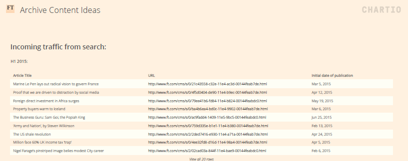 The dashboard, created in-house by the Financial Times using Chartio, shows editors which older articles are popular with readers and if they are being found through search, social media or internally