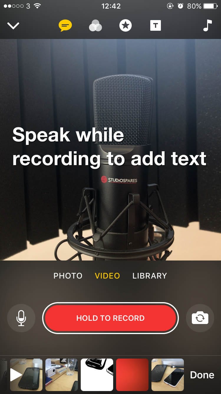 Once you are happy with your settings, press and hold the red record button at the bottom of the screen to record your first clip. Once you release the button, your video will be saved as a square thumbnail, and you will be able to record additional clips and personalise them individually with captions and stickers.