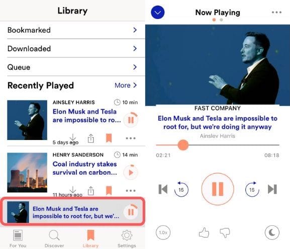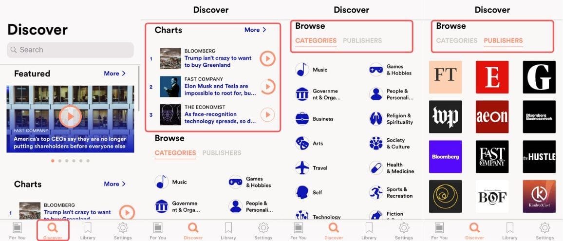 Here, you can see featured stories, a ‘charts list’ of most listened-to articles, as well as browse through a variety of different categories and publishers.