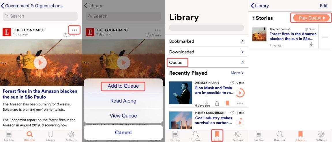 To do this, click the three dots above an article and then select ‘Add to Queue’. Go to the Library section or the app, click Queue, and select Play Queue.