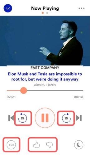 Listeners can jump forwards or backwards 15 seconds by clicking either side of the pause/play button, adjust the play speed by clicking on the icon at the bottom left of the screen and like or dislike the article by clicking one of the two thumbs at the bottom of the screen.