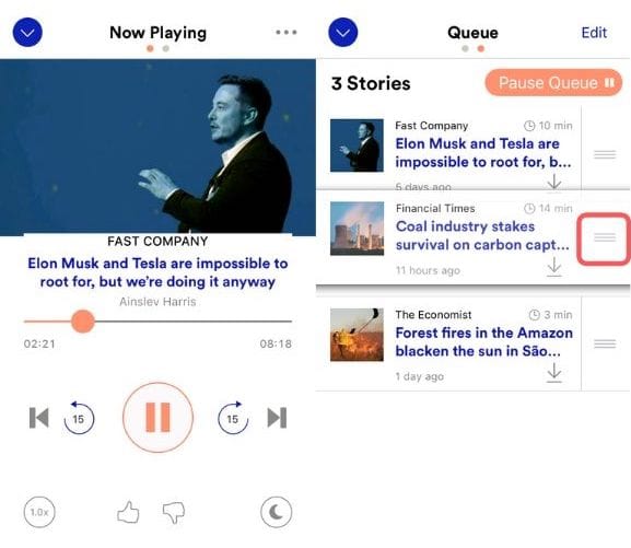By swiping right on the Now Playing screen, you can also view your Queue and can easily rearrange the order by selecting the three horizontal lines icon on the article you want to move and moving it to a different place.