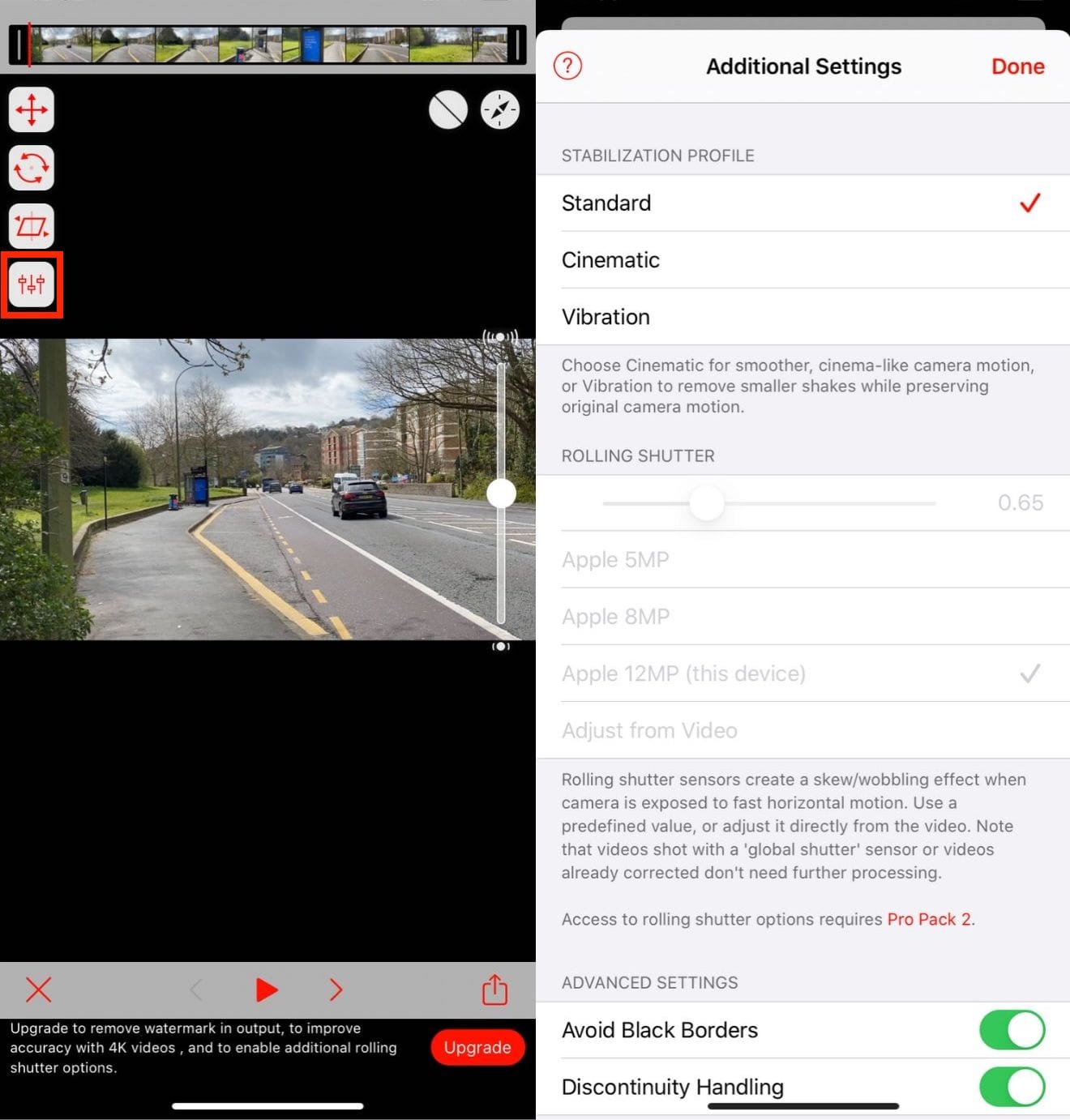 Additional stabilisation settings can be found by clicking the bottom icon on the left of the screen, with the ability to change the 'stablisation profile' to Cinematic for a smoother camera motion, or Vibration to remove smaller shakes while preserving the original motion of the camera.