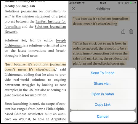 Pocket also allows you to highlight stand-out passages and phrases by holding and dragging over text. From the options menu, you can view all of your highlights together. It is excellent for note-taking, and you can share these individually as well.