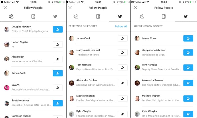 This will find any Pocket users who you also follow on Twitter and give you the option to follow them. Pocket will also recommend you other people to follow based on your interests.