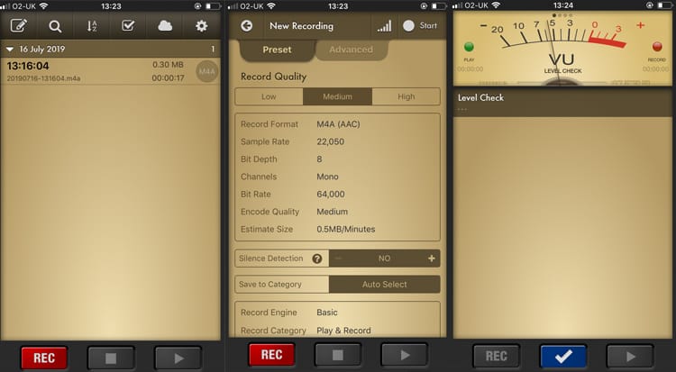 The first thing you will need to do is record audio into the app. From the home screen, there is a red 'rec' button. Hit it, and you will find preset and advanced recording settings.