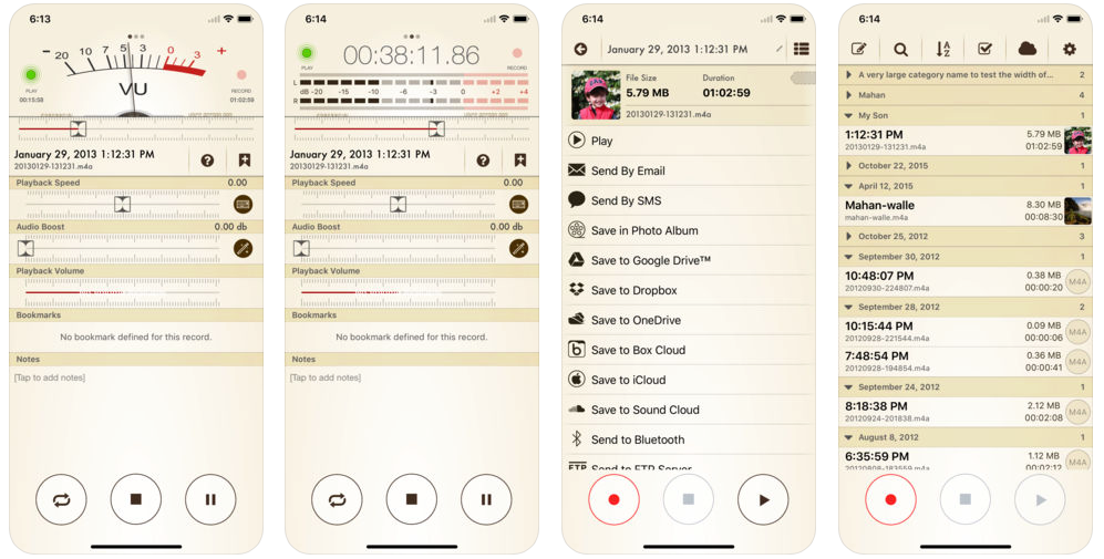 You can also add audio files to the app that were recorded externally, from Google Drive, Box Cloud, Dropbox and more, useful when you want to use the app’s functionality to join multiple audio records into one.