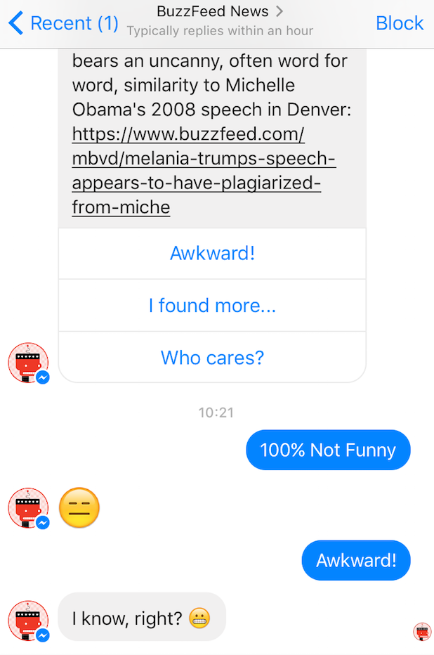 All the interactions that follow are based on key moments from the convention. Throughout the chat with the bot, users are asked for input: reacting to a story with an emoji or telling BuzzBot if they thought the situation surrounding the similarities between Melania Trump's and Michelle Obama's speeches was 'awkward' or 'who cares?'.