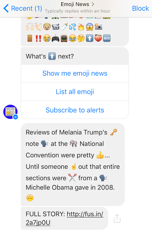 The Messenger bot does exactly what is says on the tin, delivering news summaries by replacing key words with emojis, accompanied by links to the full stories on the site.