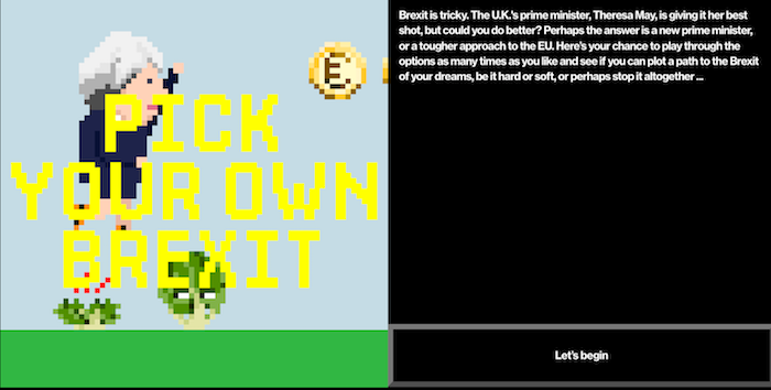 Bloomberg has used a range of creative ways to convey Brexit to a wide audience, including an 8-bit style game where players go through different options for leaving the EU, an explainer on how a parliamentary vote works, an investigative piece into how hedge funds made millions from private polling during the referendum, and travelling across the country to portray a wider picture to readers.