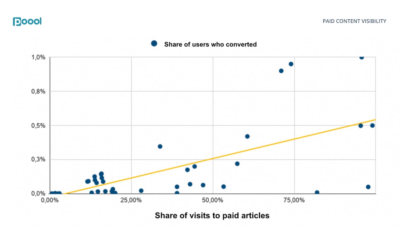 In a Poool study, analysing 75 digital publishers’ premium content strategies, we discovered a correlation between traffic on premium content and the reader-to-subscriber conversion rate, but only up to 40 per cent of premium content visibility. That means 40 per cent of your visitors would be exposed to premium content.