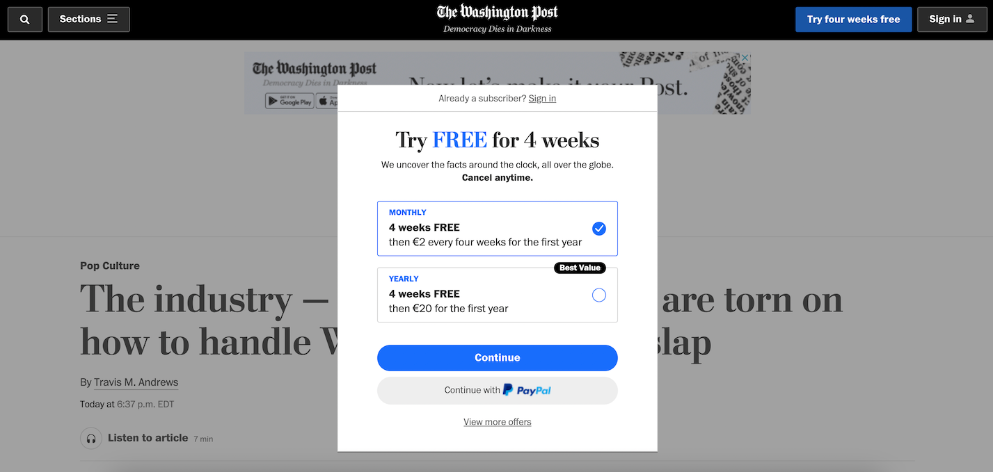 These three successful digital publishers, for instance, all have close to 100 per cent wall visibility rate, achieved in different ways: whilst Financial Times presents a full page paywall, showing only the article title, The Washington Post employs a pop-up hard paywall and The New York Times blocks the full article with an anti-scroll paywall. This means every visitor to the site sees the paywall.