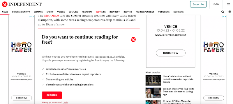 'Registration walls', another valuable conversion step, ask a user to create a free account in order to unlock content. Again, this increases engagement and collects valuable data points for personalising a user's experience, targeting ads for higher ARPU and informing your strategy to later present the paywall at the right time, in the right way.