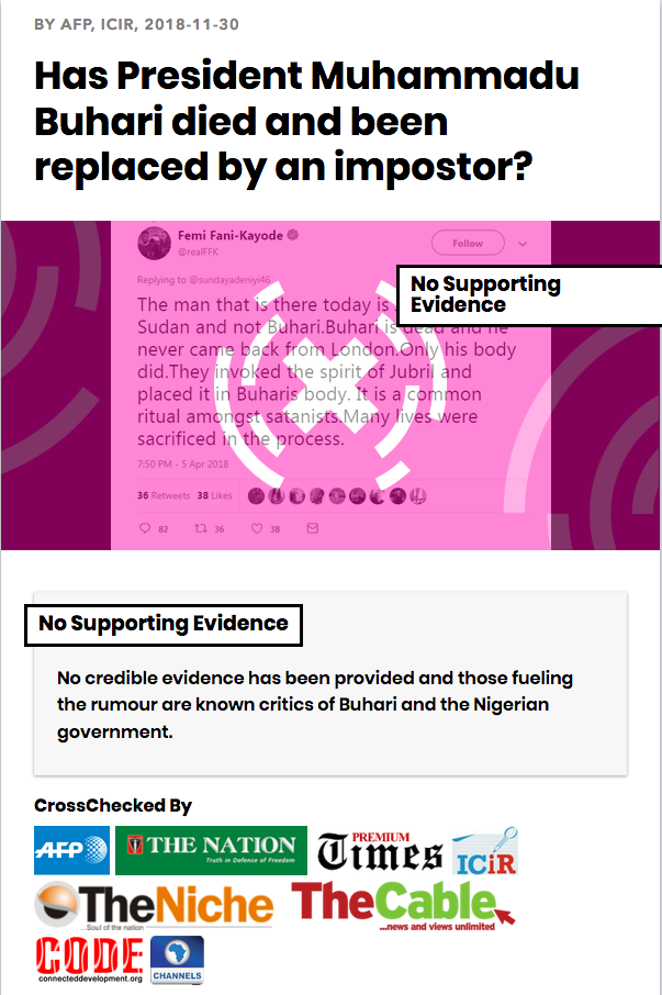 Aiyetan gives an example of a recently debunked rumour that claimed President Muhammadu Buhari had been cloned as proof of the power of collaborative verification.