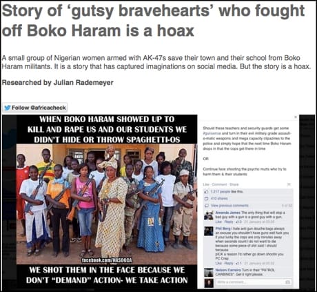 One example is the case of the "gutsy bravehearts who fought off Boko Haram", which was not at all what it claimed to be on social media, but an image taken in Mali in 2012.