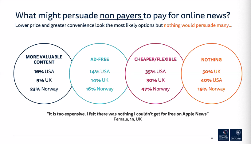 Some are also persuaded to pay to get ad-free content but in counties like the UK, half of the audience is not willing to pay for news at all.