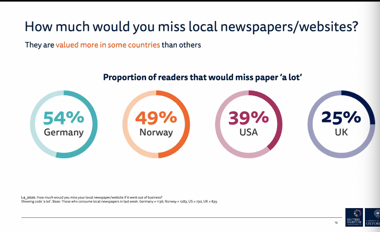 The UK picture is even bleaker when it comes to local news - three-quarters of respondents who regularly read local newspapers and websites said they would not miss them at all if they disappeared.