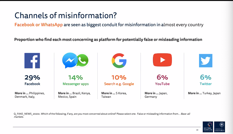 The choice of news sources also matters when it comes to misinformation. Four in ten respondents consider social media as the main source of misinformation, while only two in ten are concerned about misleading information on news sites.