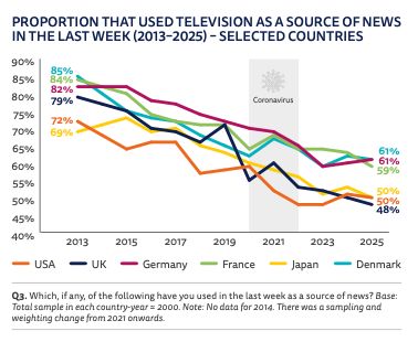 The move makes sense: the DNR shows the slump of TV news viewership over the last 12 years in many major markets like the UK (down 31 percentage points) and the US (down 22 percentage points).
