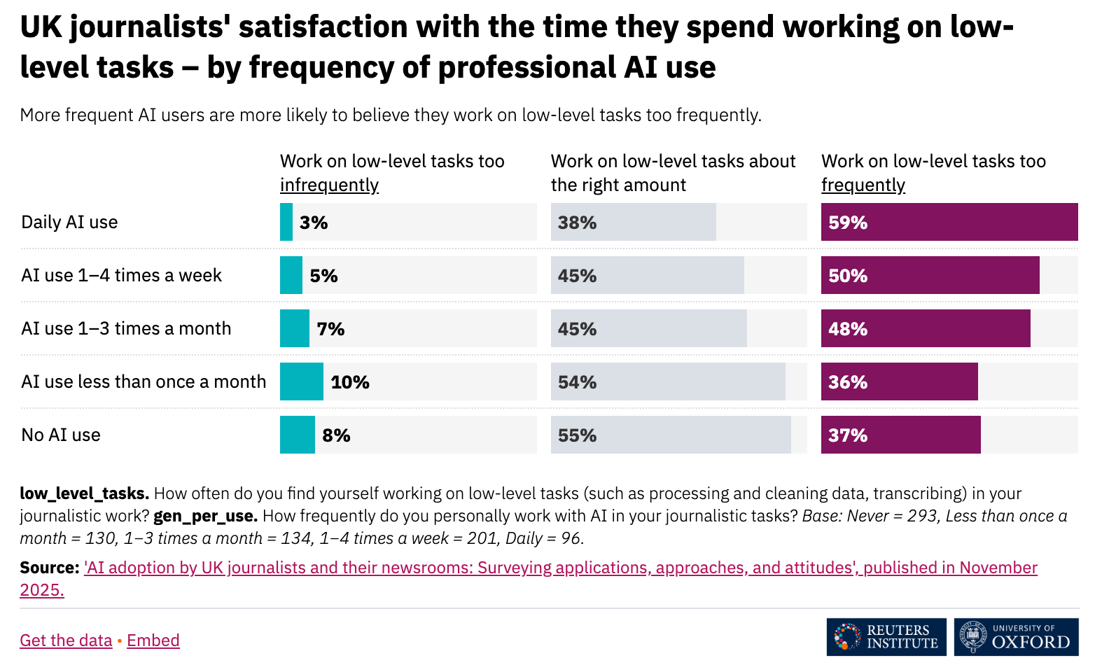 Has AI improved journalists’ job satisfaction? Those using AI more often are more likely to believe they work on low-level tasks too frequently and are not more satisfied with the amount of time they work on complex and creative tasks.