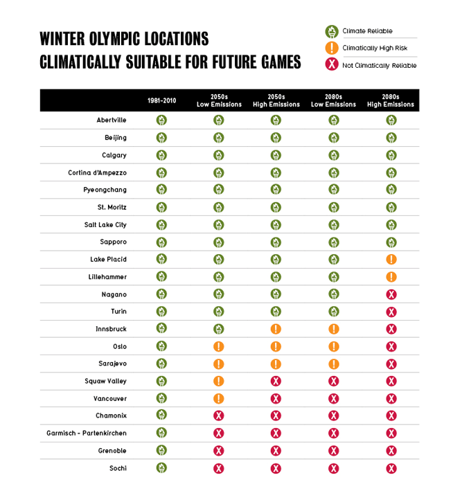 In 2012 Beijing resorted to drastic measures to decrease pollution for athletes during the Summer Olympic games. A University of Waterloo study rated the 21 previous Winter Olympic games host cities by their climate reliability. Increasing greenhouse gas emissions could leave 13 of the previous host cities too warm to host the games again.