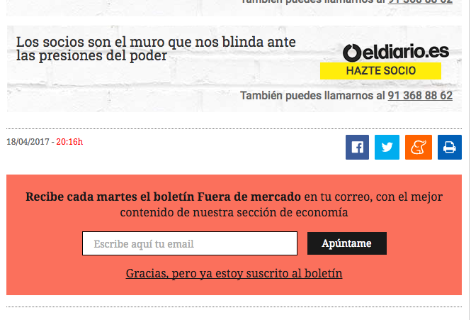 He said people choose to subscribe because El Diario is not affiliated with any of the political powers in Spain, and also because of its commitment to transparency: like other member-supported news outlets, such as De Correspondent, El Diario publishes a breakdown of its revenues twice a year, outlining how much they've made and how much they've spent on operating costs and salaries. "That transparency is helping to build trust."