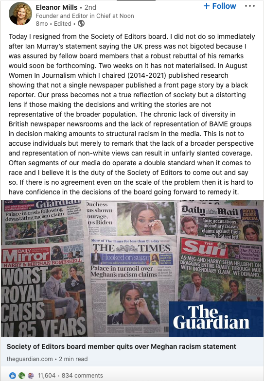 2021 will be in part remembered by two events. One is the Oprah Winfrey's interview with Prince Harry and Meghan Markle, in which the royal couple claimed that the British tabloid press was 'racist and bigoted'. The second was a statement from The Society of Editors (SoE), a major UK media industry body, refuting this claim.