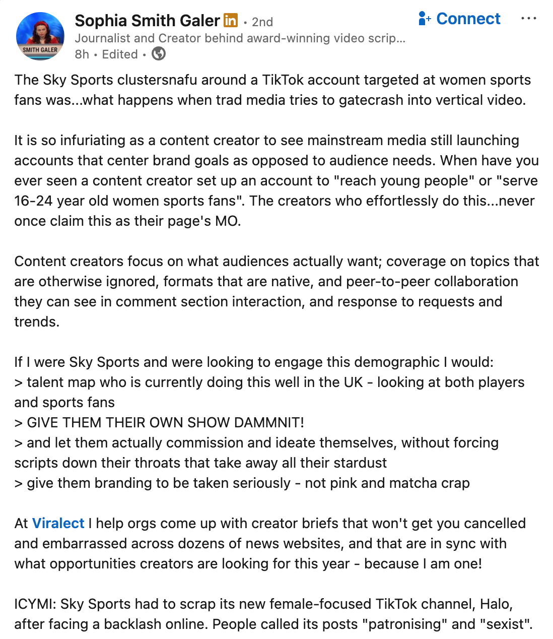 In case you missed it over the weekend, Sky Sports shut down its TikTok account, Halo, which was supposed to be female-focused and ended up becoming sexist.