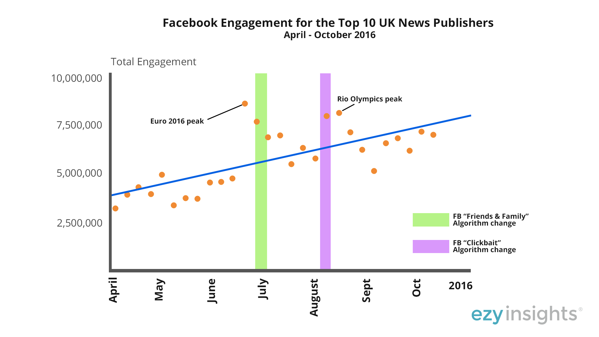 Once peaks for Euro 2016 and the Rio Olympics were averaged out, the figures for April and October 2016 mark the start and end points for a period of consistent growth of Facebook users engaging with content submitted by the UK’s leading news publishers.