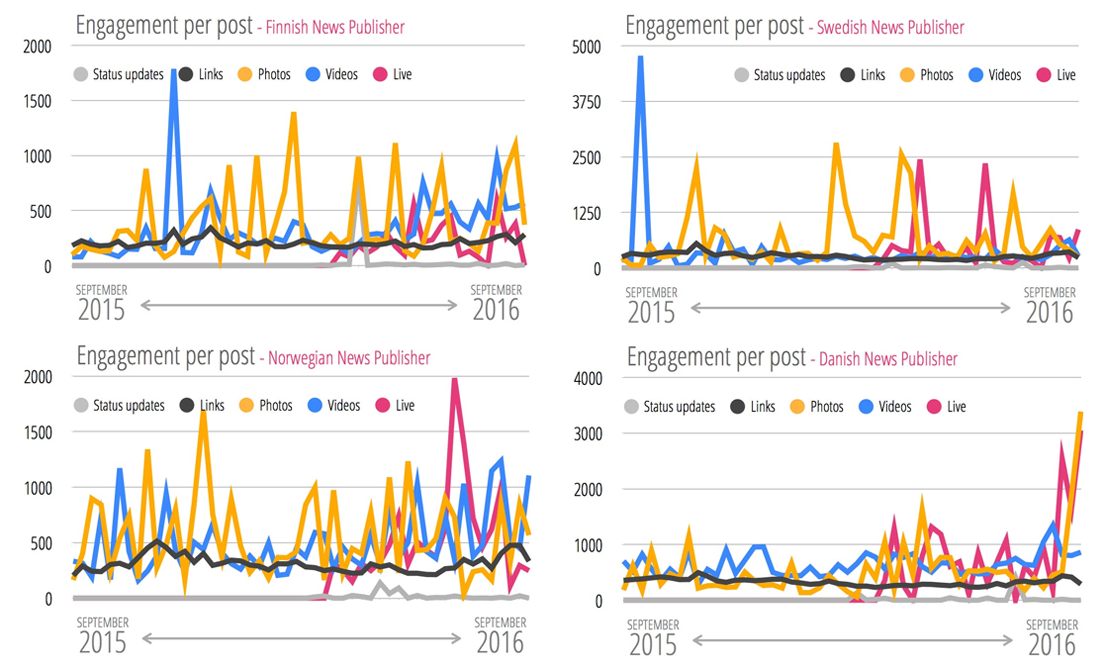 The leading US news publishers saw total engagement climb from 5,002,171 on 4 April this year to 9,965,309 by 5 September 2016, while the leading Nordic news publishers saw growth from 929,892 to 1,055,236 over the same period.