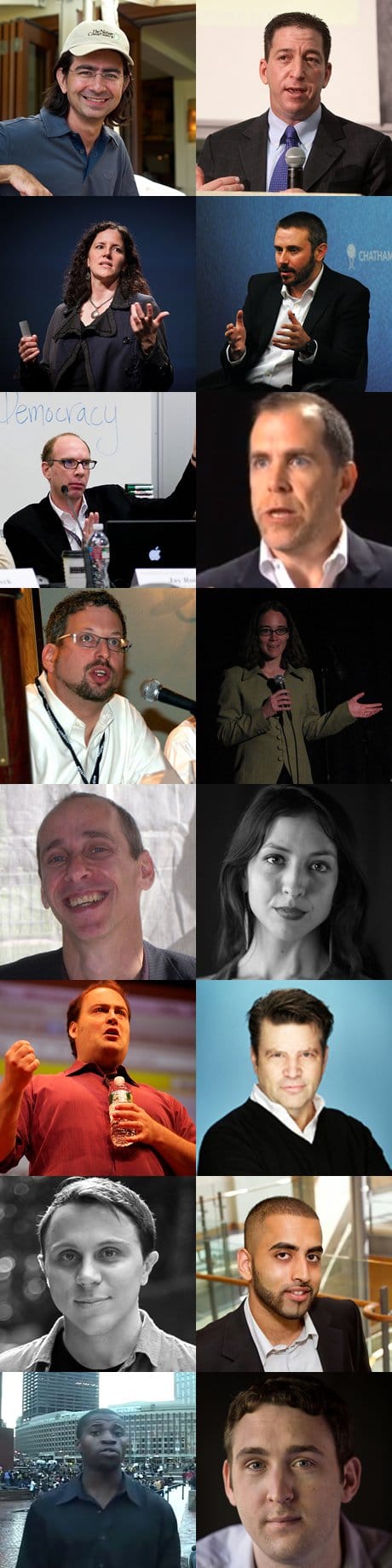 Image credits: Pierre Omidyar: By Joi on Flickr. Some rights reserved . Glenn Greenwald: By Gage Skidmore on Flickr. Some rights reserved . Jeremy Scahill: By Chatham House, London on Flickr. Some rights reserved . Jay Rosen: By Joi on Flickr. Some rights reserved . Laura Poitras: By Kris Krug on Flickr. Some rights reserved . Eric Bates: Screenshot from video . Liliana Segura: Image courtesy of First Look Media Dan Froomkin: By yksin on Flickr. Some rights reserved . Marcy Wheeler: By ragesoss on Flickr. Some rights reserved . Peter Maass: By Larry D. Moore on Wikimedia Commons. Some rights reserved . Andy Carvin: By personaldemocracy on Flickr. Some rights reserved . Bill Gannon: Image courtesy of Bill Gannon Ryan Devereaux: Image courtesy of Ryan Devereaux Murtaza Hussain: Image courtesy of Martaza Hussain Andrew Jones: Screenshot from video Ryan Gallagher: Image courtesy of Ryan Gallagher