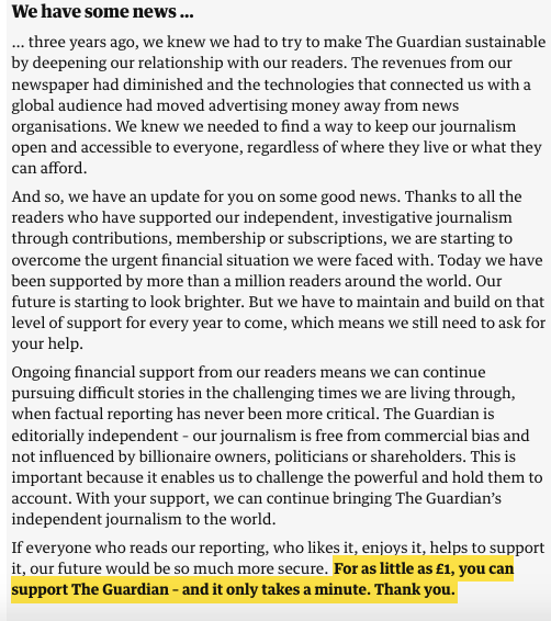 The publisher wrote one specific pitch to readers, addressing the reader directly, acknowledging what is happening in the media landscape, and reassuring them that no contribution is too small.