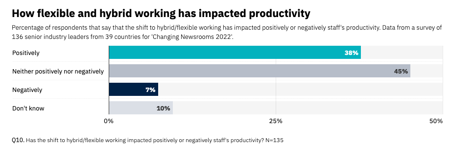 Research from the Reuters Institute for the Study of Journalism (RISJ) found that nearly two thirds (61 per cent) of news organisations are formally committed to a hybrid newsroom - a model of two or three days in the office, and the rest at home. The data is based on a survey of 136 senior industry leaders from 39 countries and a series of in-depth interviews.