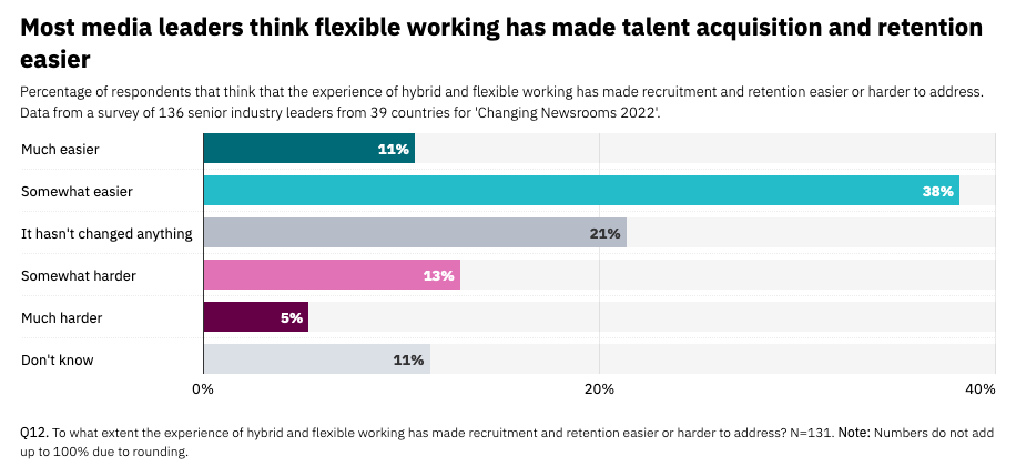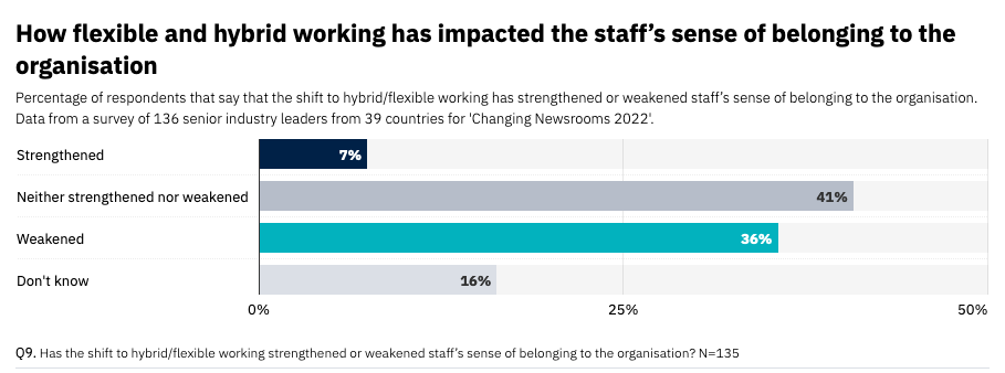 This is a decline from the 79 per cent of organisations who were "on board" with hybrid last year, but hybrid is still emerging as the direction of travel for newsrooms. The difference is now this commitment is part of formal work policies.