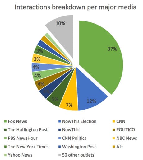 Fox News generated 35 per cent of total Facebook interactions on posts about the US election, reveals data analysis of 63 Facebook pages from news outlets