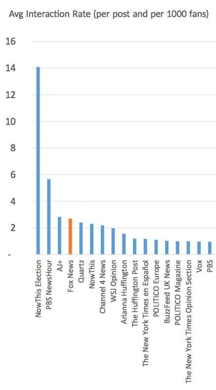 NowThis Elections (1.2 million fans) came second with 12 per cent of total interactions, and CNN (22 million fans) third, with seven per cent of total interactions.