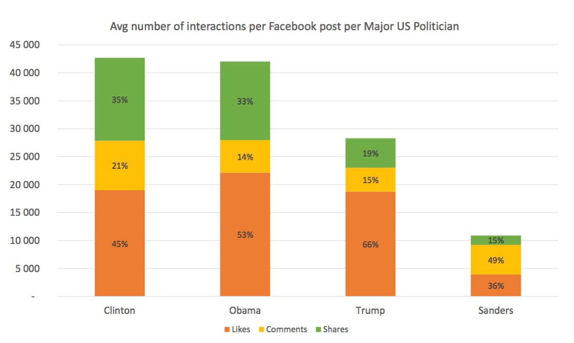 An average post about Obama or Clinton also got more shares than one about Trump. Some 35 per cent of the interactions related to a post about Obama or Clinton were shares, compared to 19 per cent for posts about Trump.