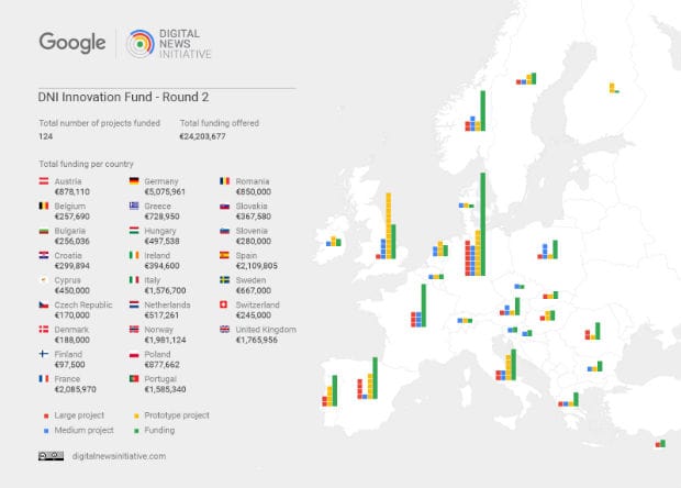 As part the second round of funding provided by the Digital News Initiative (DNI) in Europe, 124 projects developed by media organisations in 25 countries will receive €24 million (£20.6m) to innovate in the digital space, Google announced today.