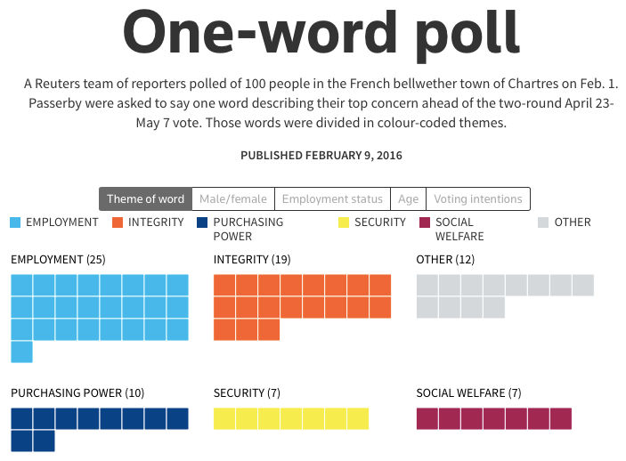Reuters has been publishing daily reports in different formats about the elections in France since November, when François Fillon won the primary race to become the centre-right candidate. Such frequent and detailed reports about an election campaign are a new approach for Reuters, explained Callus.