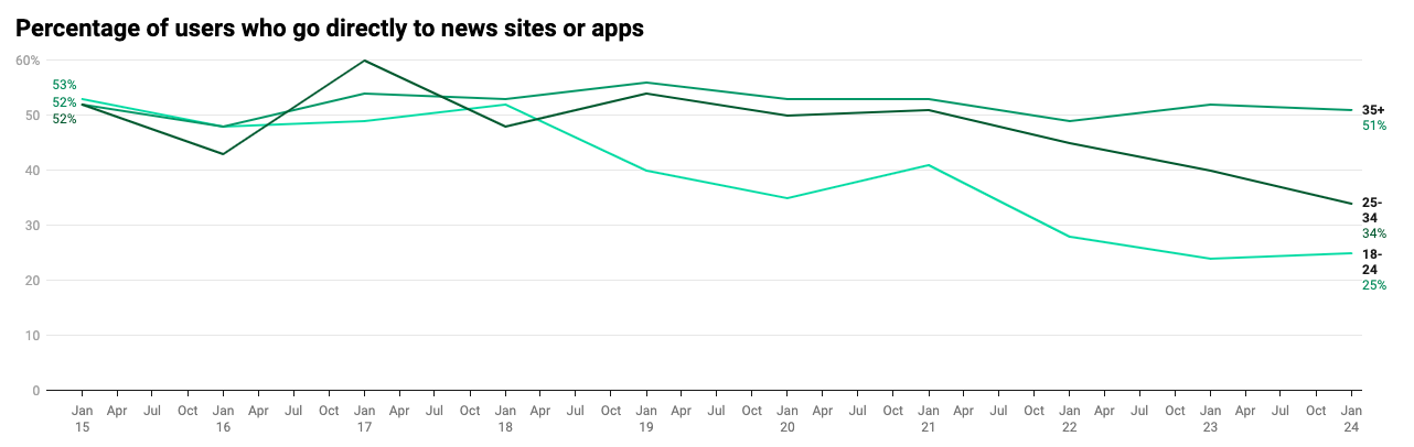 In 2015, younger audiences came directly to sites and apps at the same rate, 53 per cent, as older generations, but by 2024, the rate had dropped by half for younger audiences.